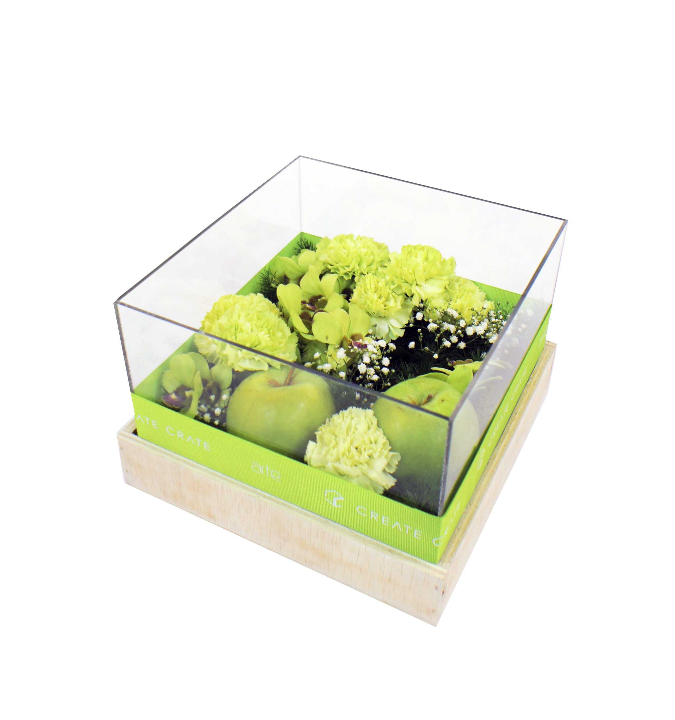 This refreshing crate of energising floral concoctions will uplift and take you on a journey of smiles. The combination of apples, green orchid, green carnation, baby breath, fish leaf and oasis adds a refreshing twist to your surroundings.