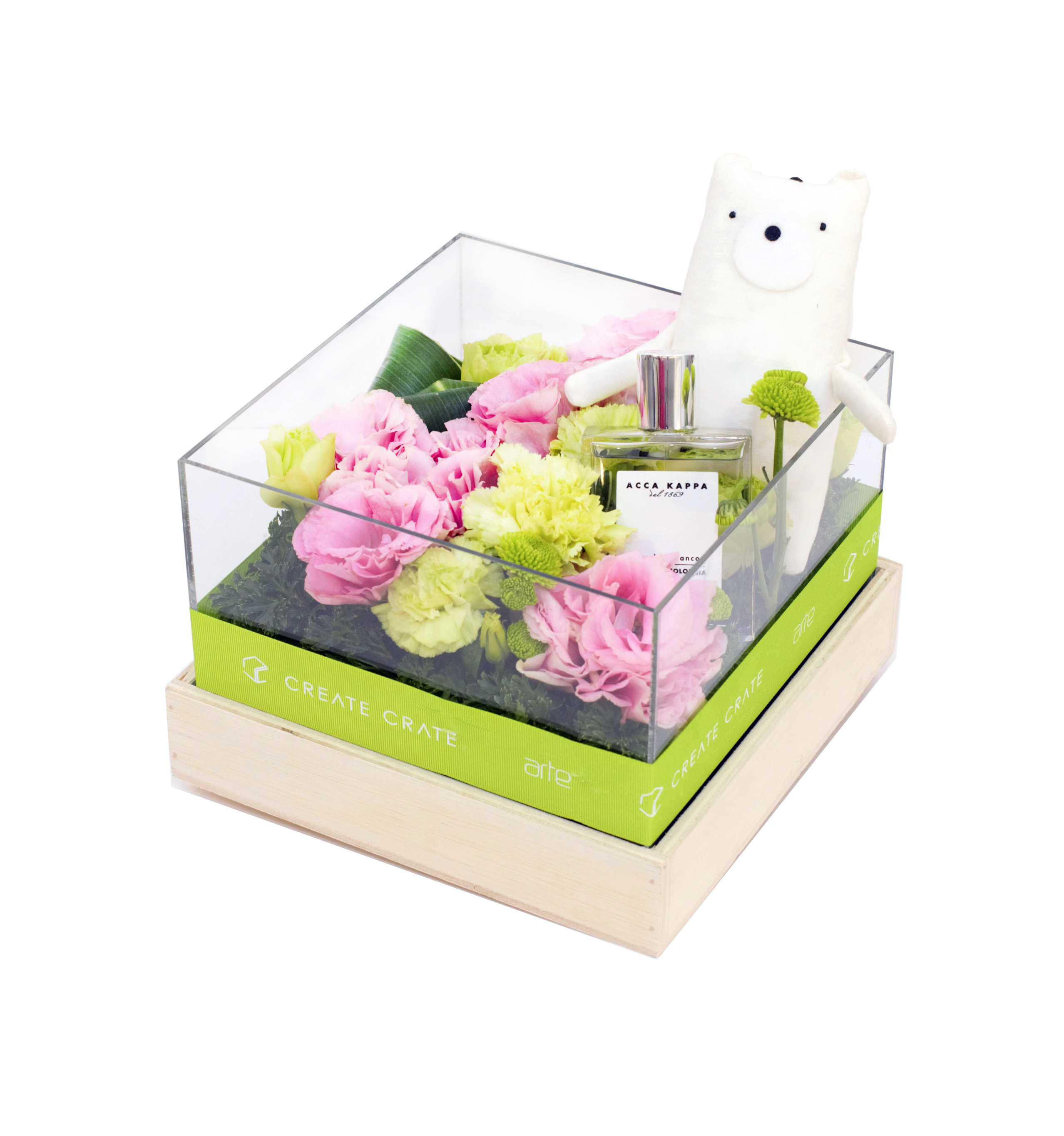 Pamper your special someone with this amazing combination of White Bear Aromatherapy Doll by BREATHE and Acca Kappa White Moss Fragrance, surrounded by the fresh paradise of pink eustoma, green carnation, snow white leaf, green button poms, fish leaf and oasis.